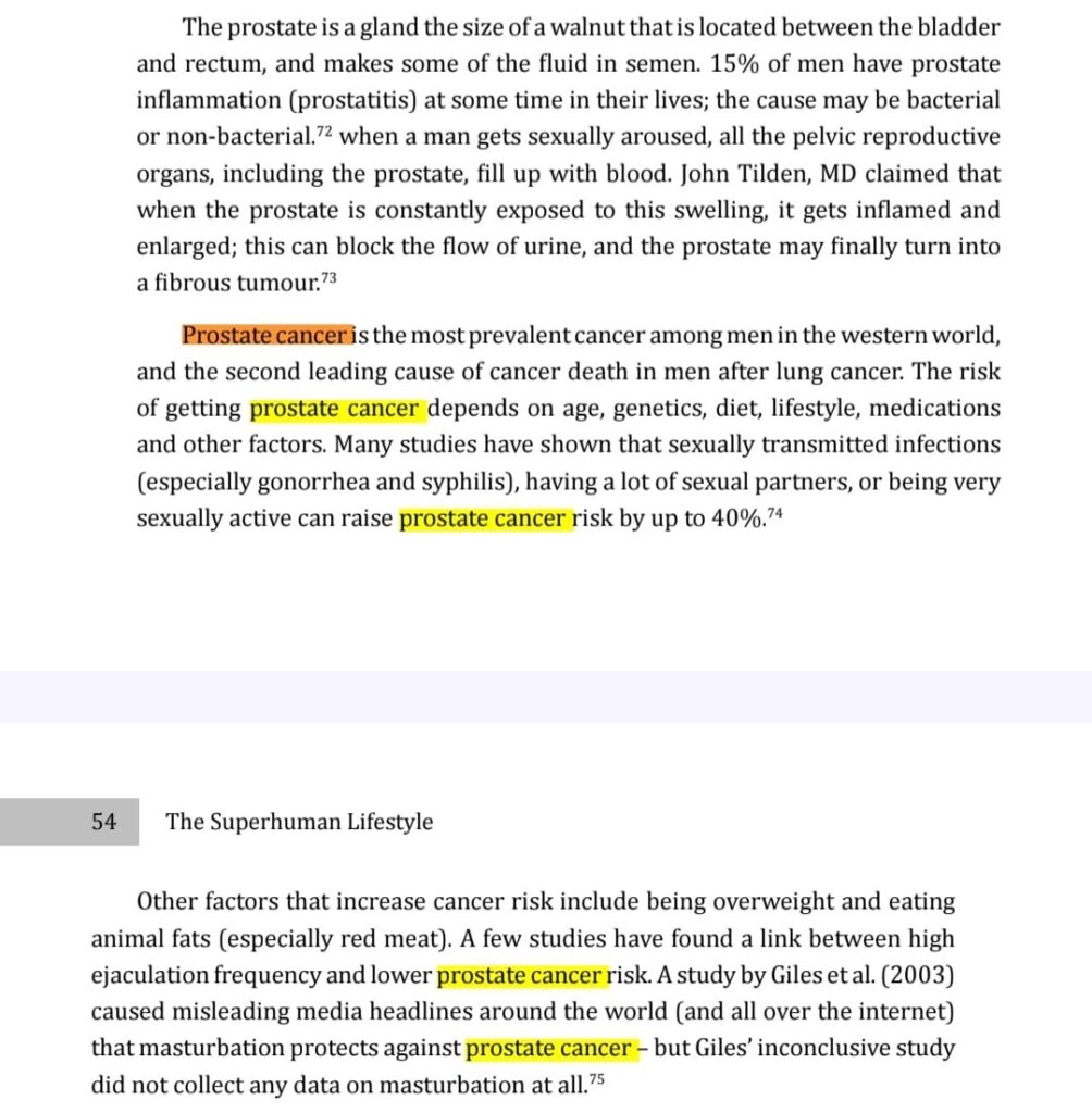 Most people and reports claim that masturbation can address prostate cancer. We have covered the true facts in detail in one of our books Superhuman Lifestyle. As you can see in the screenshot that is how much detail our founder, Radheshyam More has covered about true facts and relationships of prostate cancer and masturbation.
